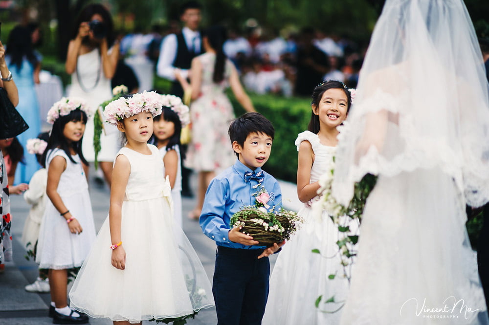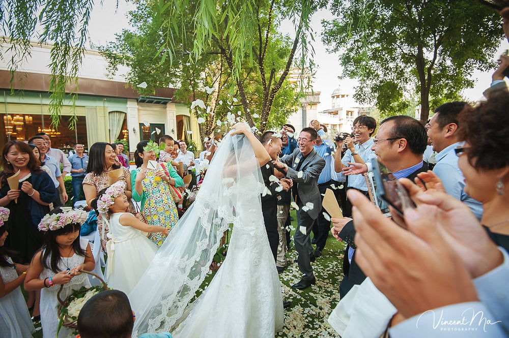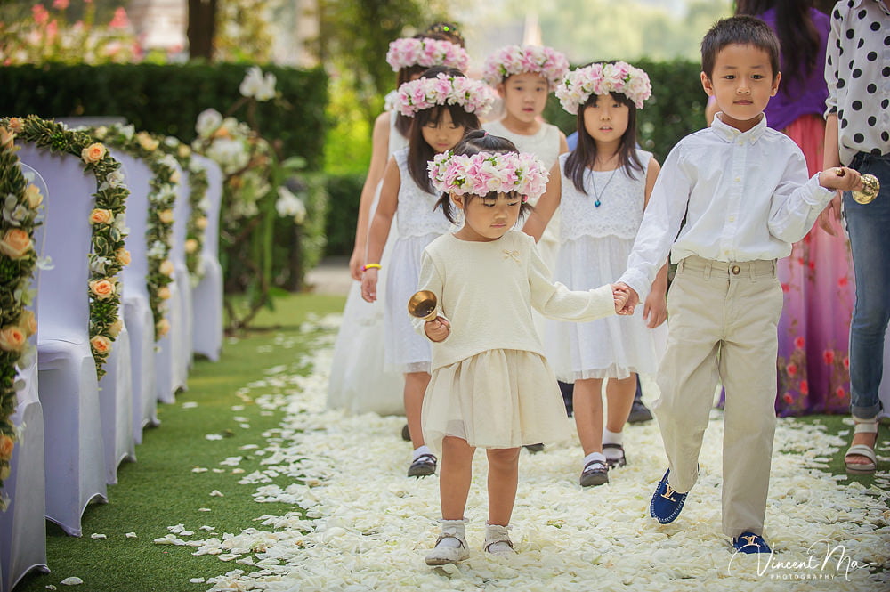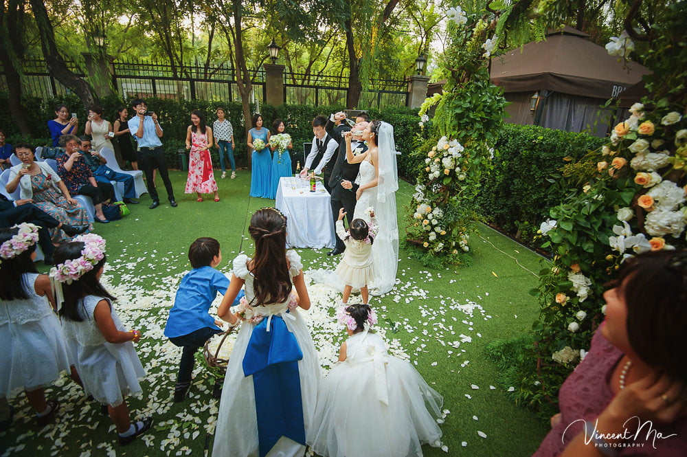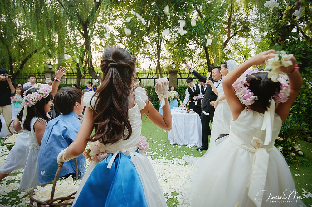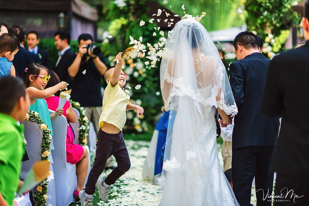 仪式还没进行完,孩子们就把婚礼现场变成自己的游乐园,争先恐后地把花瓣抛向新人,朋友们也加入进来,用花瓣把新人狠狠灌倒,满满都是爱啊!